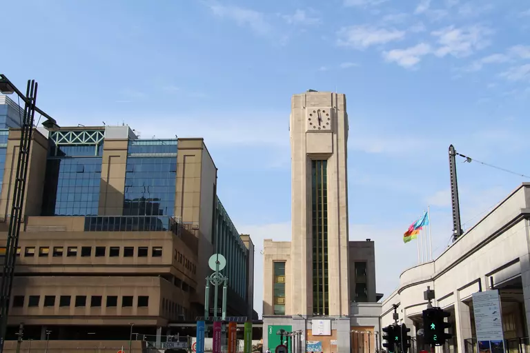 Au pied de la tour de la gare de Bruxelles Nord